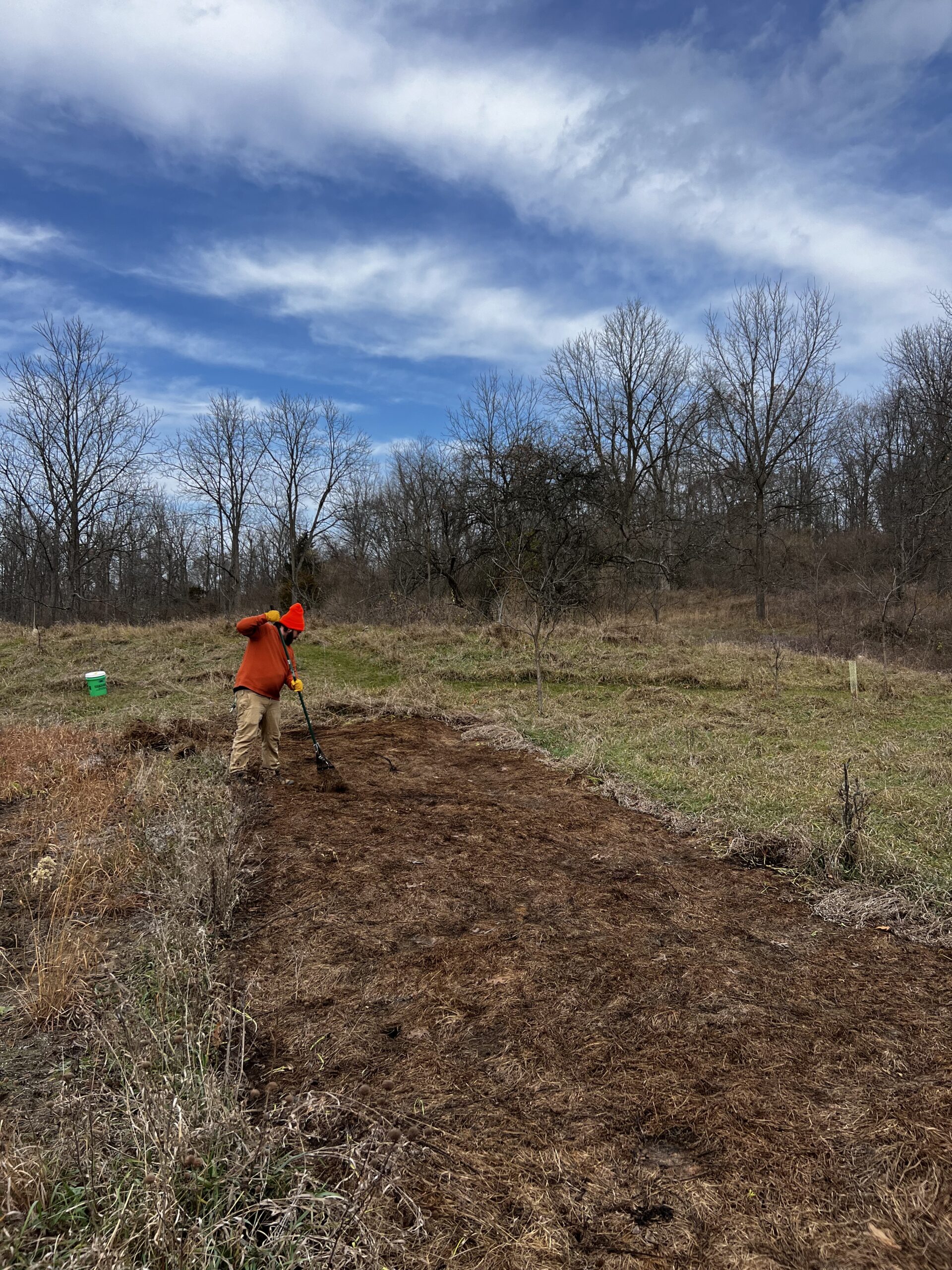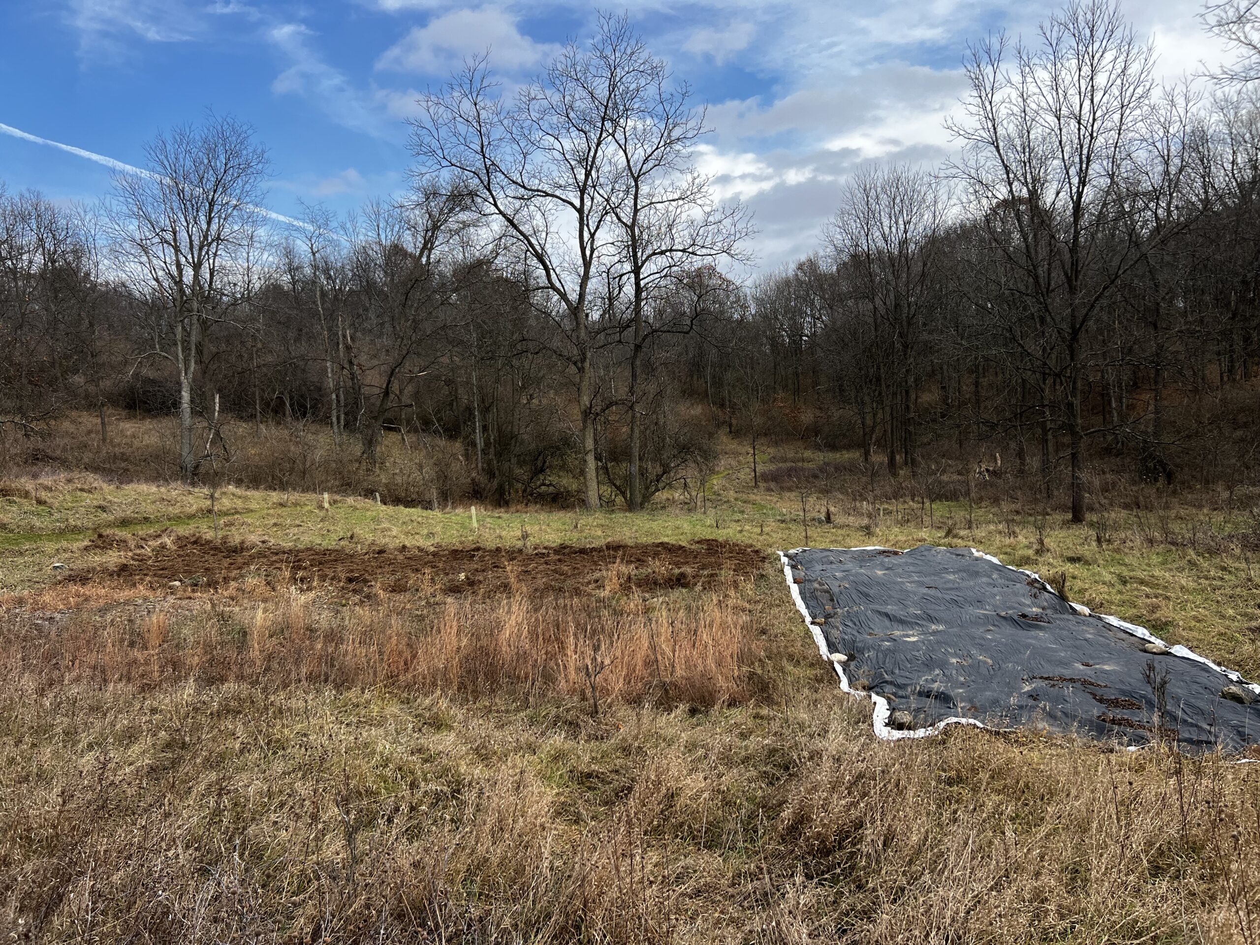 Legacy has these solarization plots at several of our preserves. After the tarp has been in place for one year, we remove it and prepare the area underneath for seeding. We rake the area until bare ground is exposed and then spread the seeds by hand.